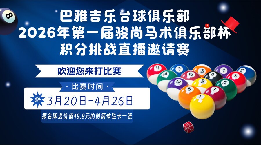 巴雅吉乐台球俱乐部2026年第一届骏尚马术俱乐部杯积分挑战直播邀请赛 2026-03-20 09:00:00 至 2026-04-26 21:00:00